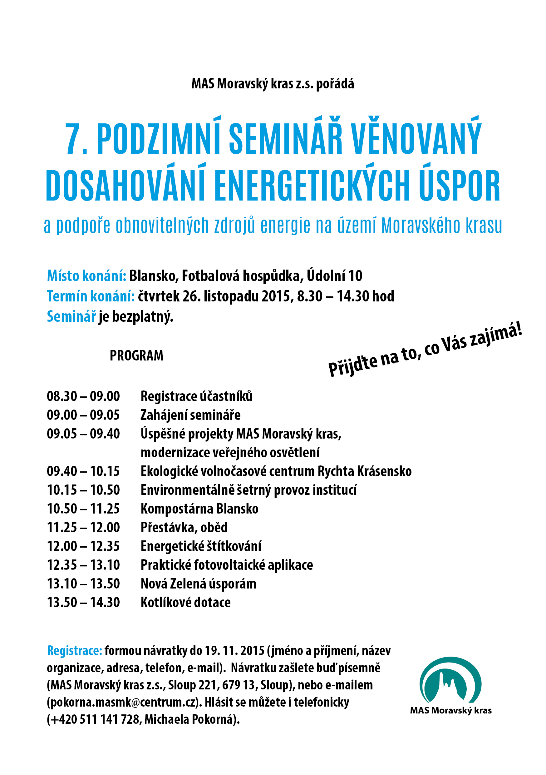 MAS Moravský kras v letošním roce uspořádala již sedmý tradiční seminář věnovaný dosahování úspor energie a podpoře obnovitelných zdrojů energie na území Moravského krasu.Seminář se konal 26. listopadu 2015 v Blansku.