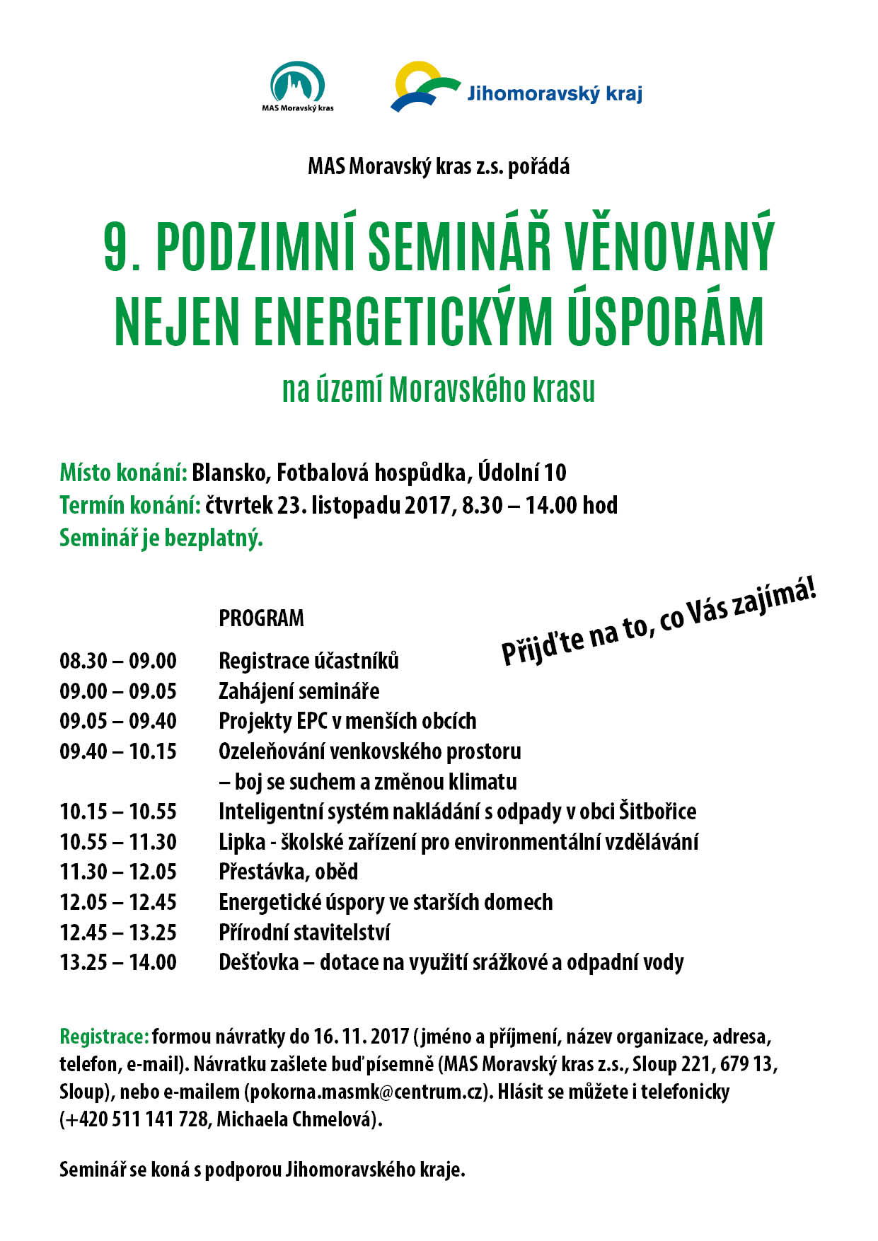 MAS Moravský kras v letošním roce uspořádala již devátý podzimní seminář věnovaný dosahování úspor energie, podpoře obnovitelných zdrojů energie a ochraně životního prostředí na území Moravského krasu.Seminář se konal 23. listopadu 2017 v Blansku.