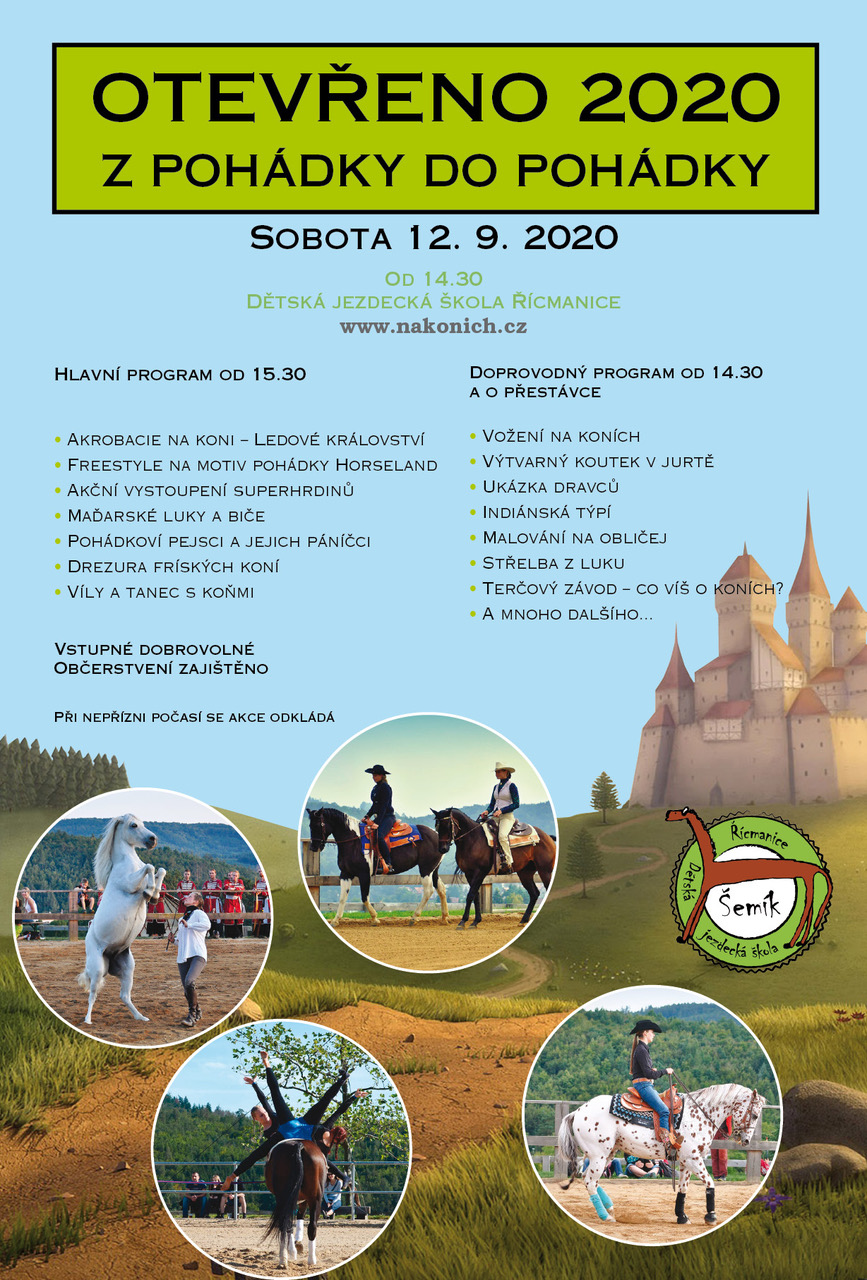 Přijměte pozvání na každoroční akci Otevřeno - tentokrát s názvem "Z pohádky do pohádky".Akce se koná v sobotu 12.9. od 14:30 na stájích - uvidíte lektorky a oblíbené koníky v různých ukázkách, pohádkách a freestylech a mnoho dalšího.