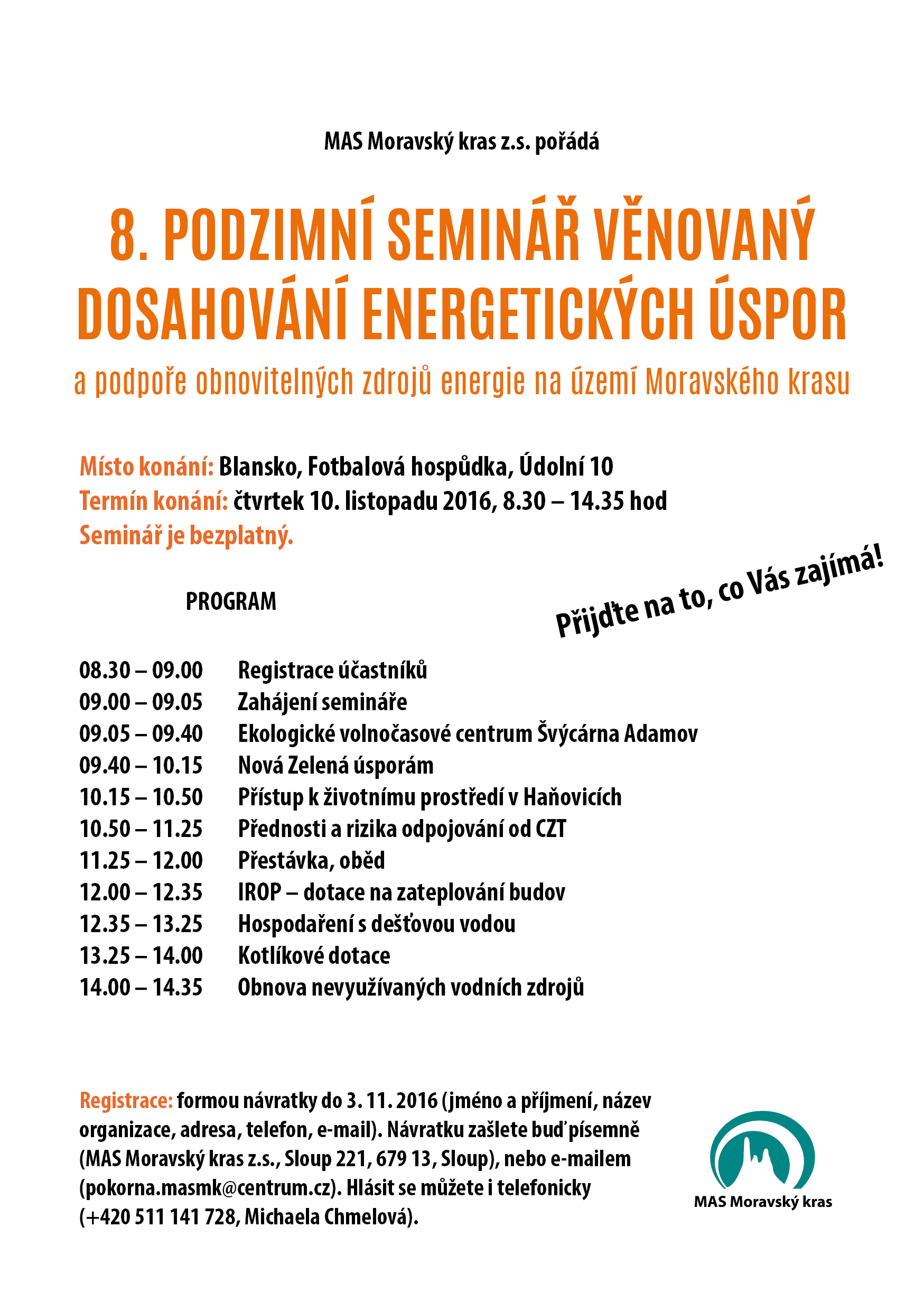 MAS Moravský kras z.s. Vás zve na tradiční podzimní seminář věnovaný dosahování energetických úspor a podpoře obnovitelných zdrojů energie na území Moravského krasu. Seminář se koná ve čtvrtek 10. listopadu 2016 v Blansku ve Fotbalové hospůdce (Údolní 10) od 8:30 do 14:35 hodin.Pestrý program mimo jiné nabídne přednášky věnované šetrnému hospodaření s dešťovou vodou, na praktickém příkladu ukáže na čem všem může obec ušetřit při spolupráci s místním zemědělským družstvem, či nás seznámí s provozem ekologického volnočasového centra Švýcárna v Josefovském údolí u Adamova. Na semináři také získáte nejaktuálnější informace k dotačním titulům na zateplování rodinných domů i budov či výměnu zdroje tepla na vytápění.